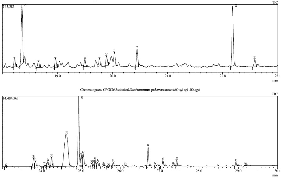 Для идентификации и количественного определения содержания индивидуальных компонентов в полученных спиртовом и петролейном экстрактах применяли метод хромато-масс-спектрометрии. На рис. 2 и 3 приведены хроматограммы спиртового и петролейного экстрактов. В табл. 2 и 3 указано содержание основных компонентов спиртового и петролейного экстрактов коры, идентифицированных с достаточно высокой степенью вероятности, относительное содержание которых выше 1%.