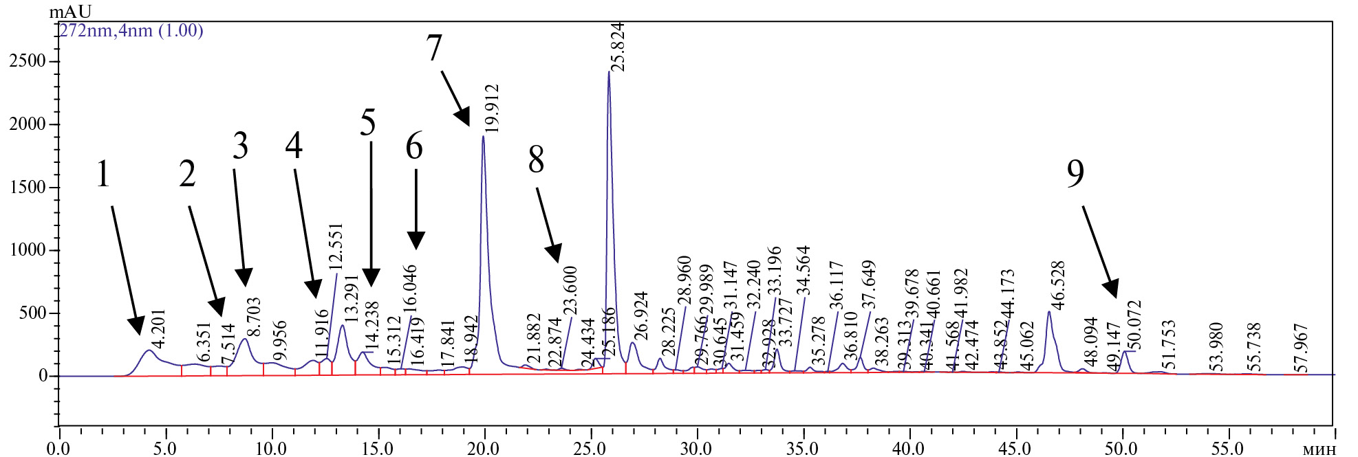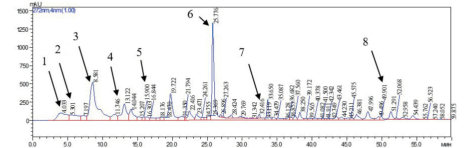 Рис. 2. Хроматограмма этанольного экстракта надземной части Centaurea phyllopoda (детектирование при длине волны 272 нм).