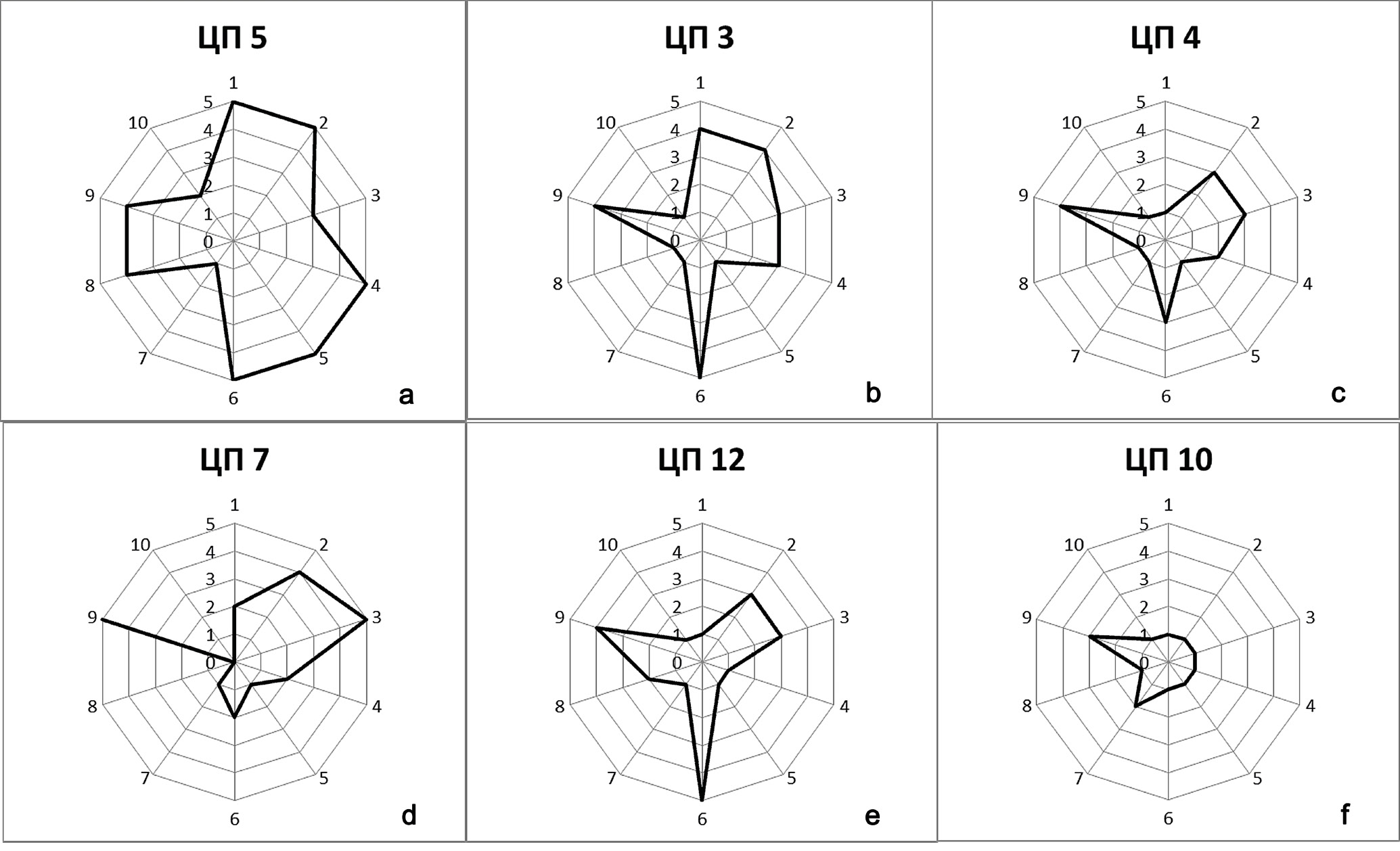 2. Fig. 1. Diagrams of the complex score assessment of the cenopopulations of Medicago falcata (ЦП) No 3–12: a – maximum (39 points) in meadow-steppe CP 5; b – second place (27 points) in CP 3 on gravelly soil near a country road, c – after a fire in CP 4 (20 points), d – haymaking, Stage II PD in CPU 7 (22 points), e – deposit (22 points) in CPU 12, f – minimum 13 points in CP 10 at stage III–IV of PD (failure). Notation from 1 to 10 – indicator number according to Tables 2 and 3; from 0 to 5 – the number of points for each indicator.
