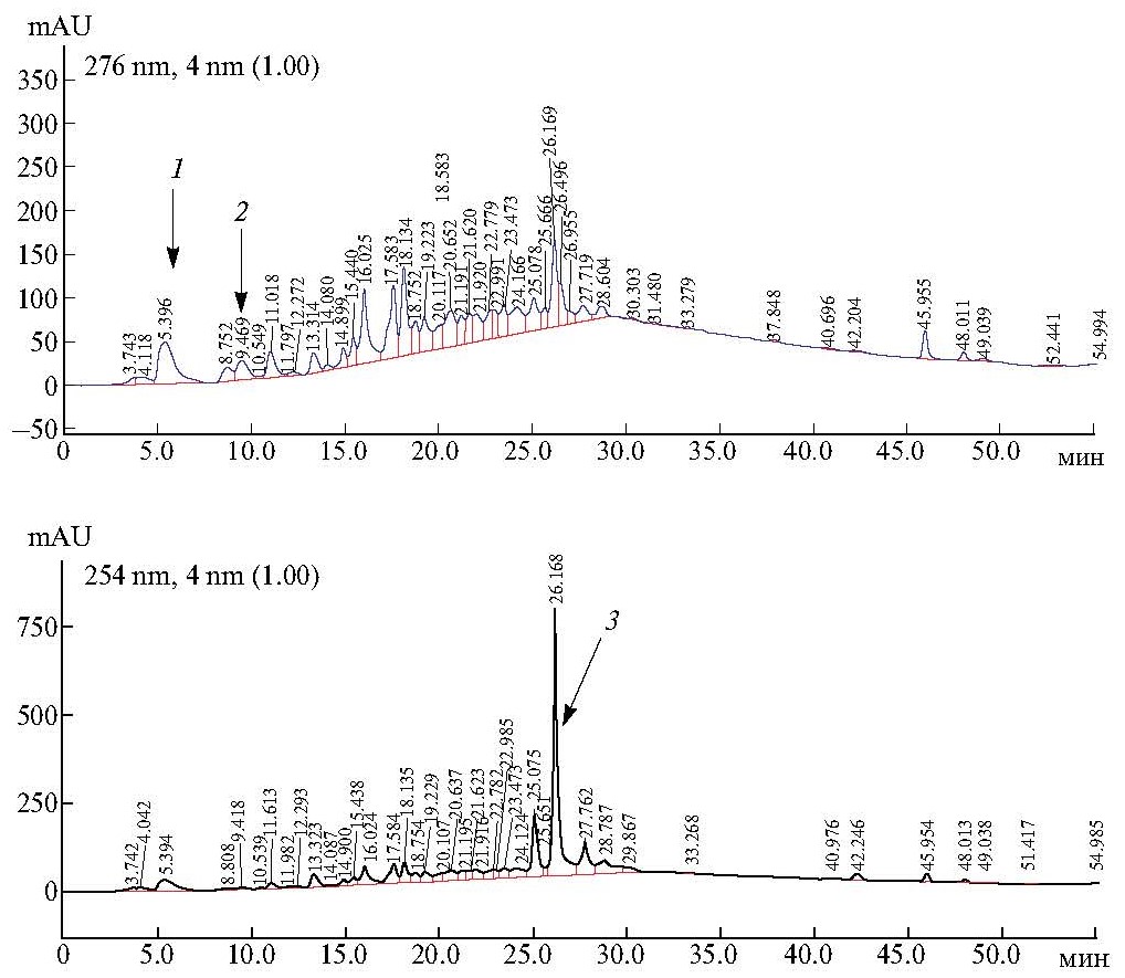 Рис. 1. ВЭЖХ этанольного экстракта подземных органов Rhodiola rosea, произрастающей близ Софийского ледника. 1 — галловая кислота, 2 — салидрозид, 3 — розавин. Детектируемые длины волн 254 нм для розавина и 276 нм для салидрозида и галловой кислоты.