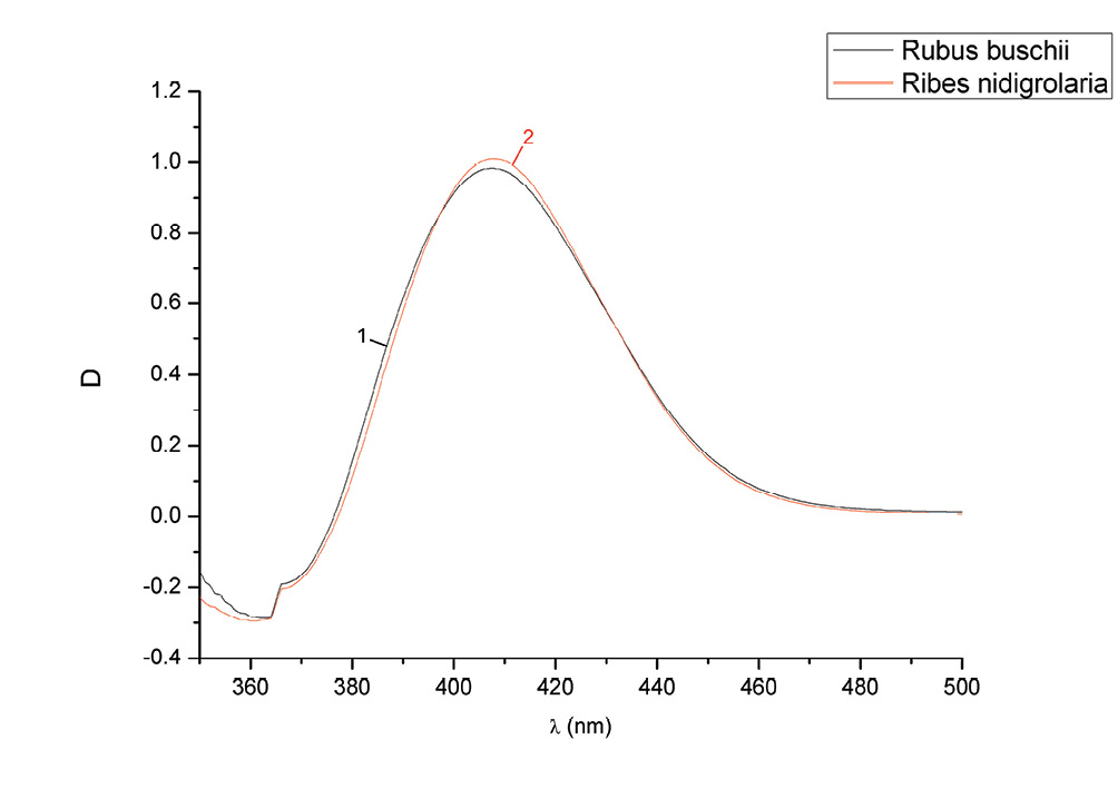 УФ-спектры поглощения комплексов флавоноидов представлены на рис. 1. Анализ данных показывает, что максимумы спектров поглощения комплексов флавоноидов с Al (III) из водно-спиртовых экстрактов находятся при 413 нм для листьев малины Буша (сел. Сурх-Дигора) и при 408 нм – для листьев йошты (г. Владикавказ).