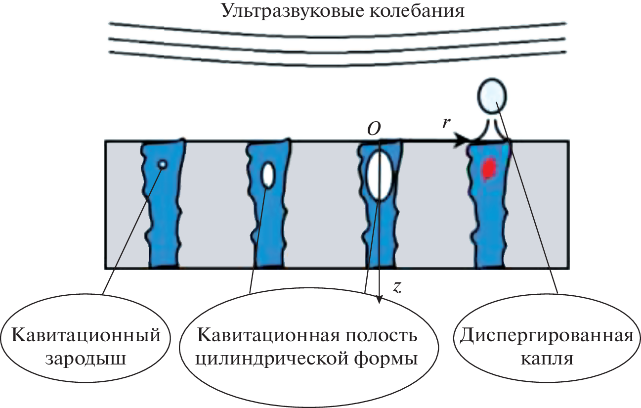 The article theoretically substantiates the ability of ultrasonic vibrations to dehydrate capillary-porous materials due to the dispersion of moisture from the capillaries and pores of the material under the action of shock waves formed by cavitation bubbles. A phenomenological model is presented based on the analysis of the slow growth of a distorted cylindrical cavitation bubble, taking into account the influence of the cylindrical capillary walls limiting its oscillations. The optimal range (150–170 dB) of ultrasonic pressure levels is revealed, at which the mechanism of cavitation moisture dispersion is realized. It is established that the optimal conditions for the action of ultrasonic vibrations on a dried material are realized when the dimensions or thicknesses of the layer of the dried material correspond to the length of ultrasonic vibrations in air.