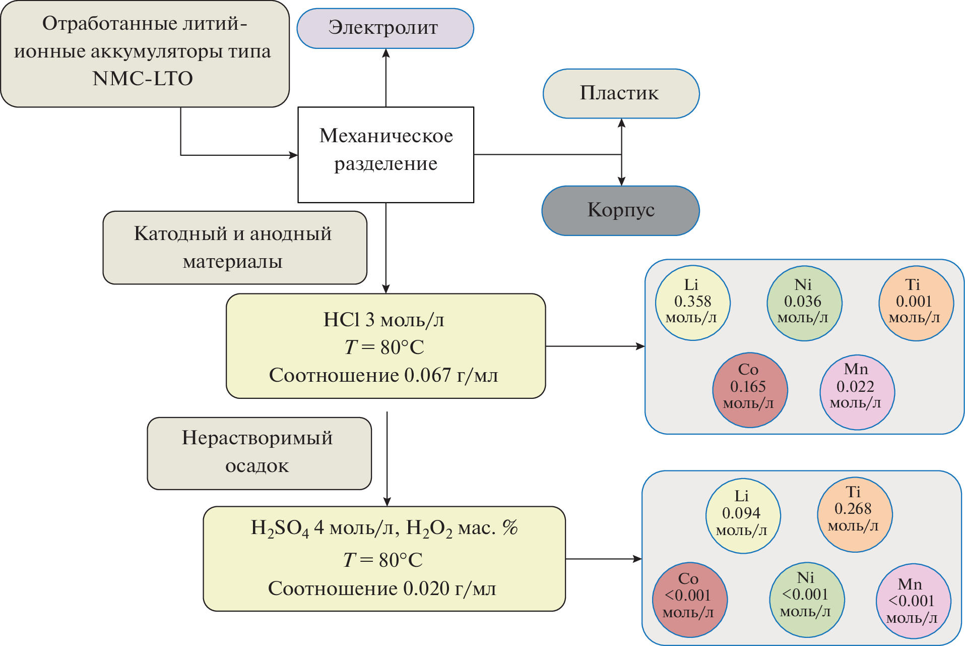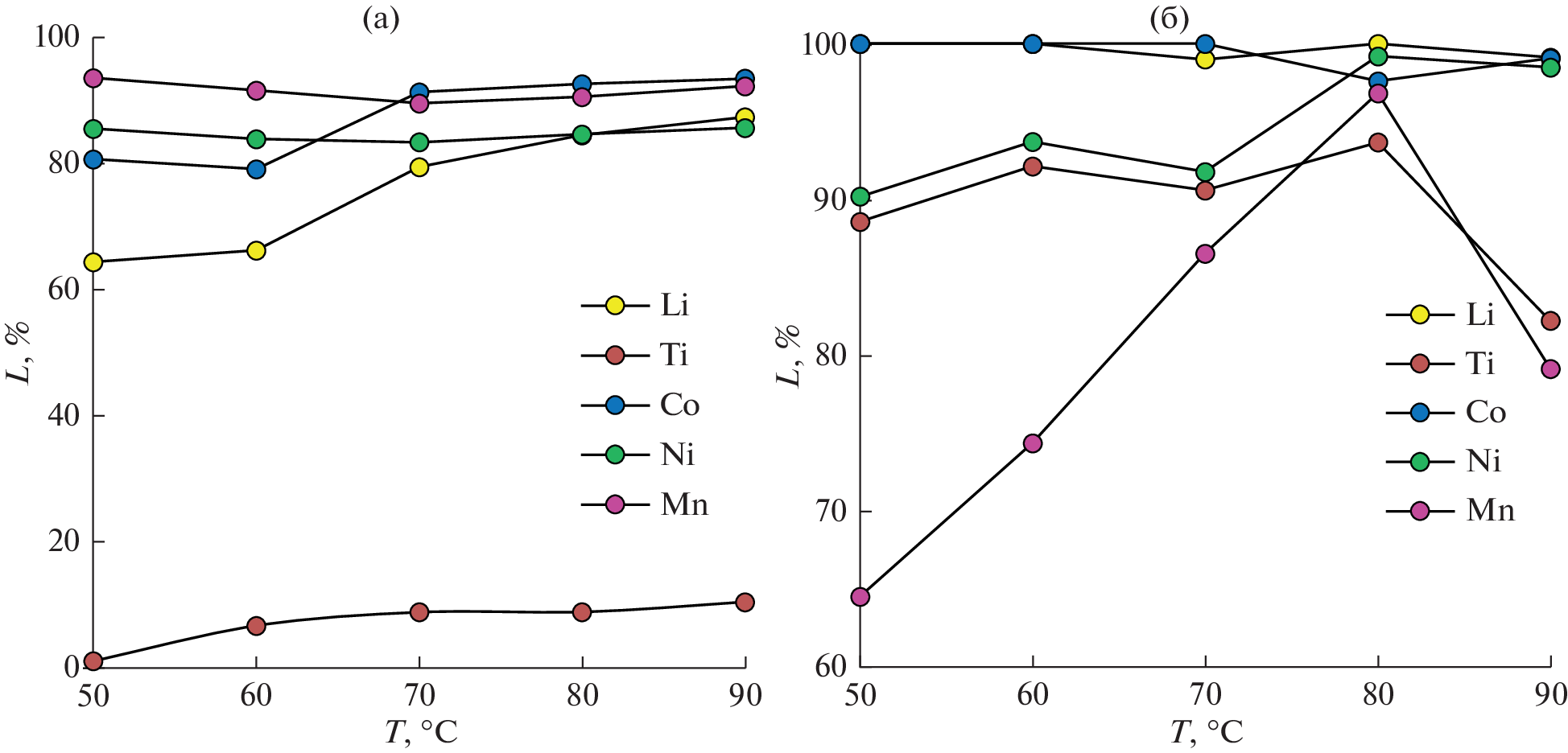 Lithium–titanate anodes are increasingly being used in the manufacturing of lithium-ion batteries due to their advantages in charge/discharge speed and safety of use relative to graphite anodes. The addition of titanium to the battery composition, along with the high content of cobalt and lithium, results in a further growth of their cost, and the reprocessing of such batteries becomes an extremely topical problem. In the framework of the present article, a comparative analysis of the hydrometallurgical reprocessing of batteries containing a lithium-titanate anode and a nickel–manganese–cobalt cathode by leaching with mineral acids (sulfuric and hydrochloric acids) is performed. In the work, the dependences of the leaching degree of the metals from real samples of the anode and cathode in their mixture on the mineral acid concentration, auxiliary additives, and solid : liquid ratio are demonstrated and the temperature and kinetic dependences for this process are obtained. Based on the results of qualitative and quantitative analysis of the leaching solutions, conditions for processing of the leaching process are proposed for further extractive separation. It is demonstrated that two-step successive leaching with hydrochloric and then sulfuric acid with the release of titanium concentrate is optimal. An important aspect of the work is the study of the joint leaching of the cathode and anode, since in the known processes of mechanical processing the stage of their separation is absent.