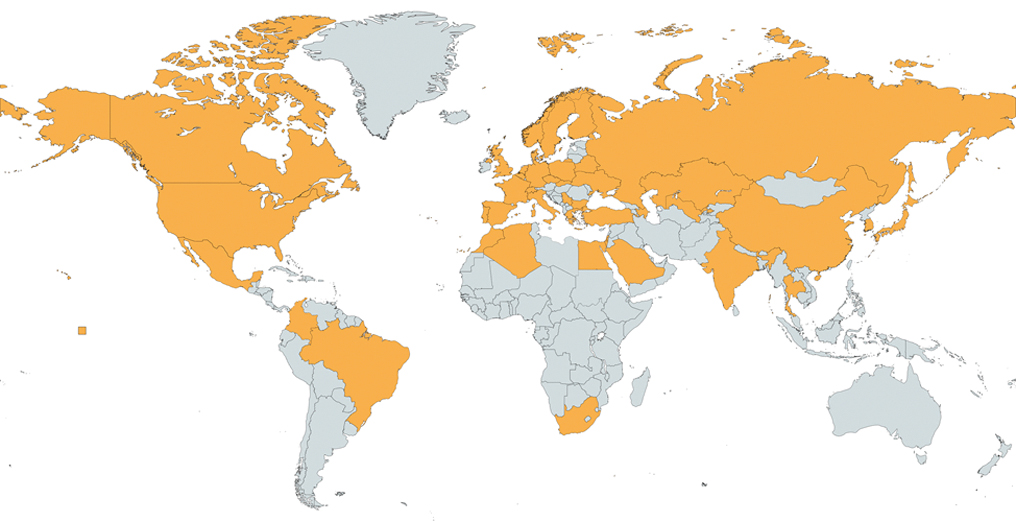 Оранжевым цветом показаны страны, представители которых участвовали в конференциях ХимРеактор в 1996–2021 гг.