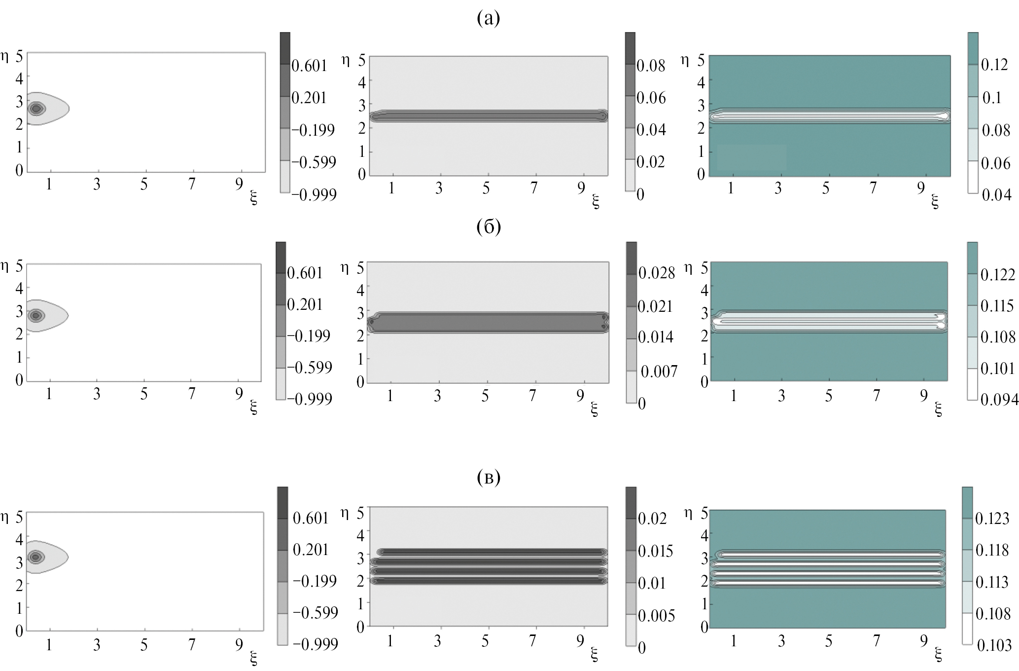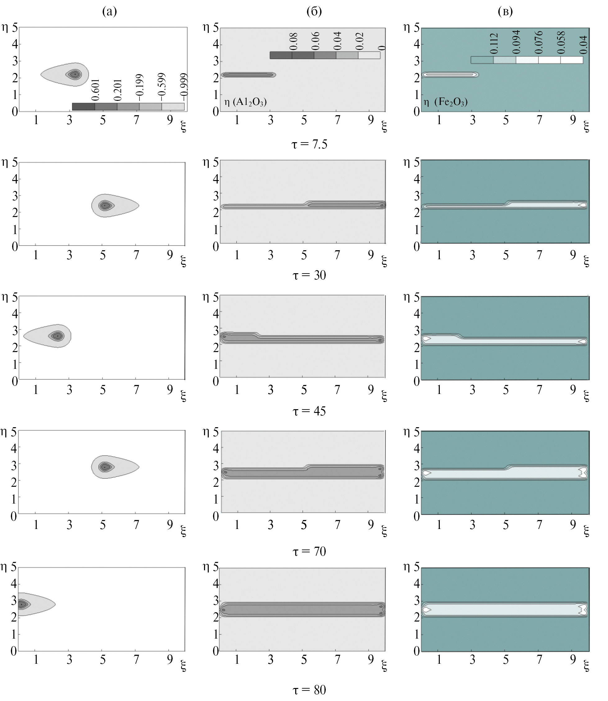 Рис. 4. Поле температуры и фазового состава продукта к моменту времени τ = 80, объемная доля оксида алюминия и объемная доля оксида железа для разной ширины сканирования: (а) hη = 20, (б) hη = 40, (в) hη = 80; Se = 18, = 0.5, Nu = 3.