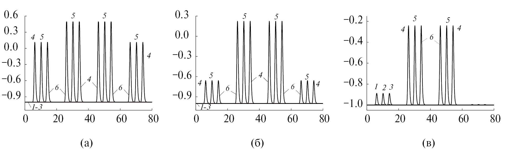 Рис. 5. Зависимость температуры в различных точках на поверхности образца от времени при варьировании ширины сканирования: (а) – hη = 20, (б) – hη = 40, (в) – hη = 80; Se = 18, = 0.5, Nu = 3. Температурные кривые соответствуют координатам: 1 – (ξ = 3, η = 1.5), 2 – (ξ = 5, η = 1.5), 3 – (ξ = 7, η = 1.5), 4 – (ξ = 3, η = 2.5), 5 – (ξ = 5, η = 2.5), 6 – (ξ = 7, η = 2.5).