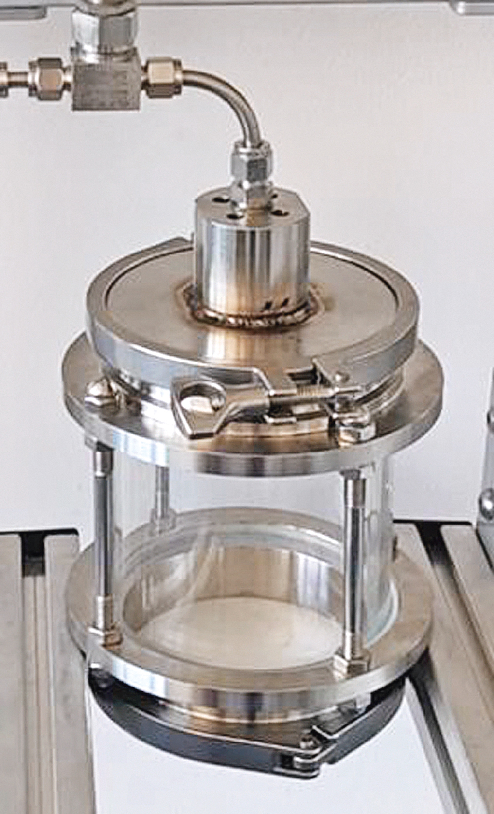 Исходя из этих данных была выбрана камера с высотой 15 см и внутренним диаметром 10 сантиметров. В качестве корпуса использован смотровой диоптр объемом 500 мл, с прозрачной стеклянной стенкой, которая обеспечивает возможность наблюдения за процессом распыления. Верхняя крышка соединена с камерой расширения кламповым соединением.