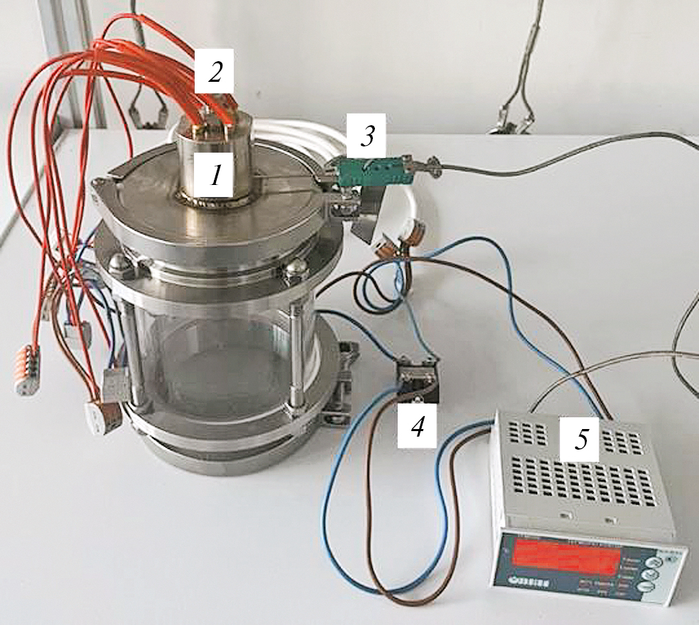 Рис. 3. Камера расширения с встроенной нагревательной системой: 1 – крышка с конструкцией для размещения патронных нагревателей, термопары и форсунки; 2 – патронные нагреватели; 3 – термопара; 4 – твердотельное реле; 5 – терморегулятор.