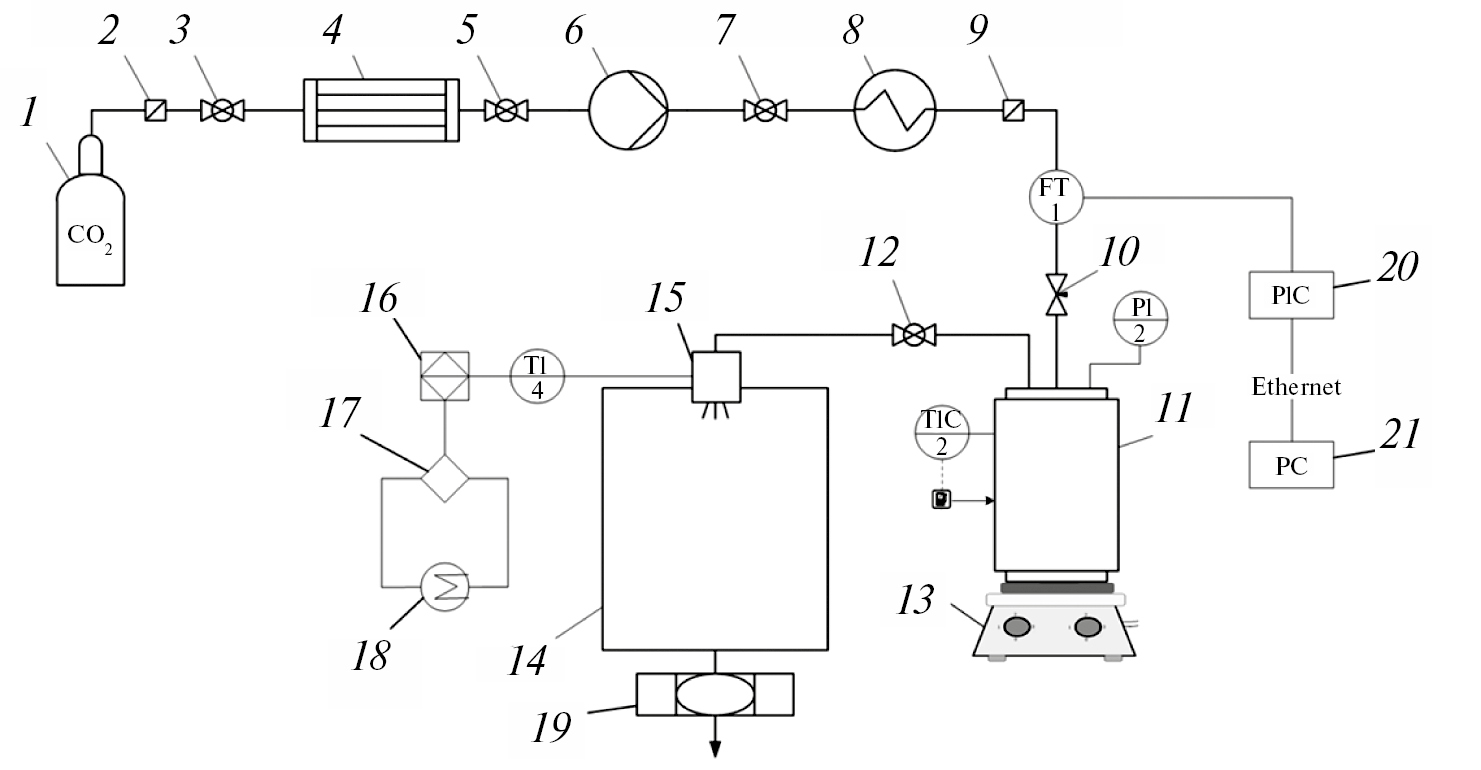 Рис. 4. Схема установки для проведения процесса RESS: 1 – баллон с диоксидом углерода; 2, 9 – фильтр; 3, 5, 7, 12 – шаровый вентиль; 4 – конденсатор; 6 – насос высокого давления; 8 – нагревательный теплообменник; 10 – игольчатый вентиль; 11 – аппарат высокого давления с нагревательной рубашкой; 13 –магнитная мешалка; 14 – камера расширения; 15 – распылительная форсунка с обогревом; 16 – терморегулятор; 17 – твердотельное реле; 18 – патронные нагреватели; 19 – фильтр; 20 – программируемый логический контроллер; 21 – персональный компьютер.