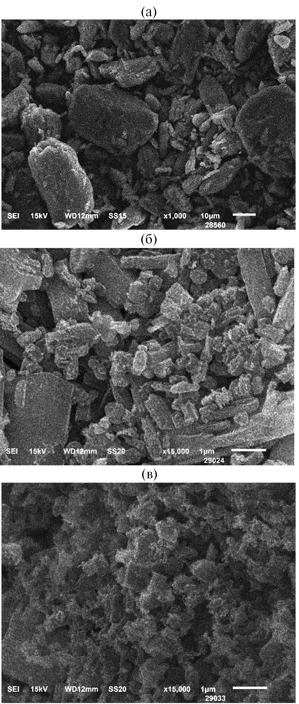 Морфологию полученных образцов исследовали с помощью сканирующего электронного микроскопа (СЭМ) JSM-6510LV (JEOL, Япония) в ЦКП РХТУ им. Д.И. Менделеева. Анализируемые образцы фиксировали на алюминиевый держатель образцов с помощью токопроводящего углеродного скотча. Затем образцы покрывали слоем платины толщиной около 5 нм на установке JFC-1 600 (JEOL, Япония). Микрофотографии образцов получали при детектировании вторичных электронов, ускоряющем напряжении – 20 кВ, фокусном расстоянии – 10 мм в диапазоне увеличений от 5000 до 100 000.