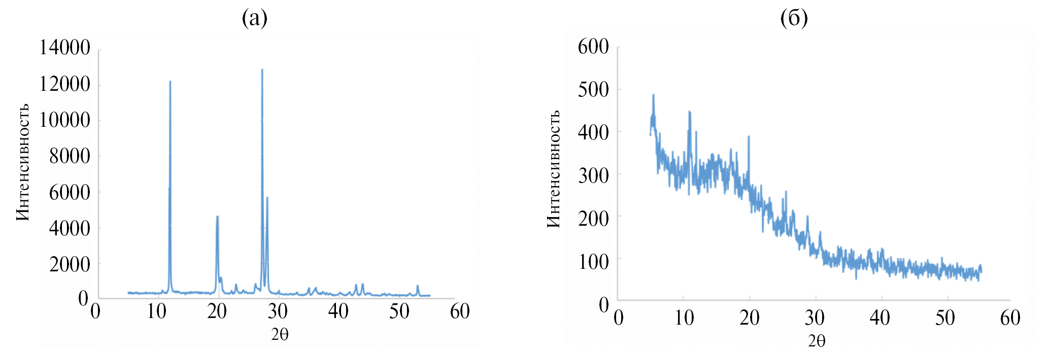 Наличие острых пиков, имеющих высокое значение интенсивности, свидетельствует о кристаллической структуре исходного фавипиравира. Установлено, что интенсивность пиков уменьшилась с 12 841 для исходных частиц (рис. 7а) до 448 для частиц, микронизированных с помощью RESS (рис. 7б), что говорит о том, что полученные частицы представлены преимущественно в аморфной форме.