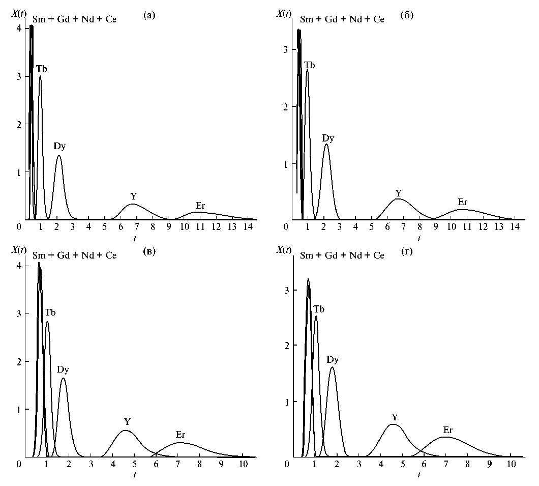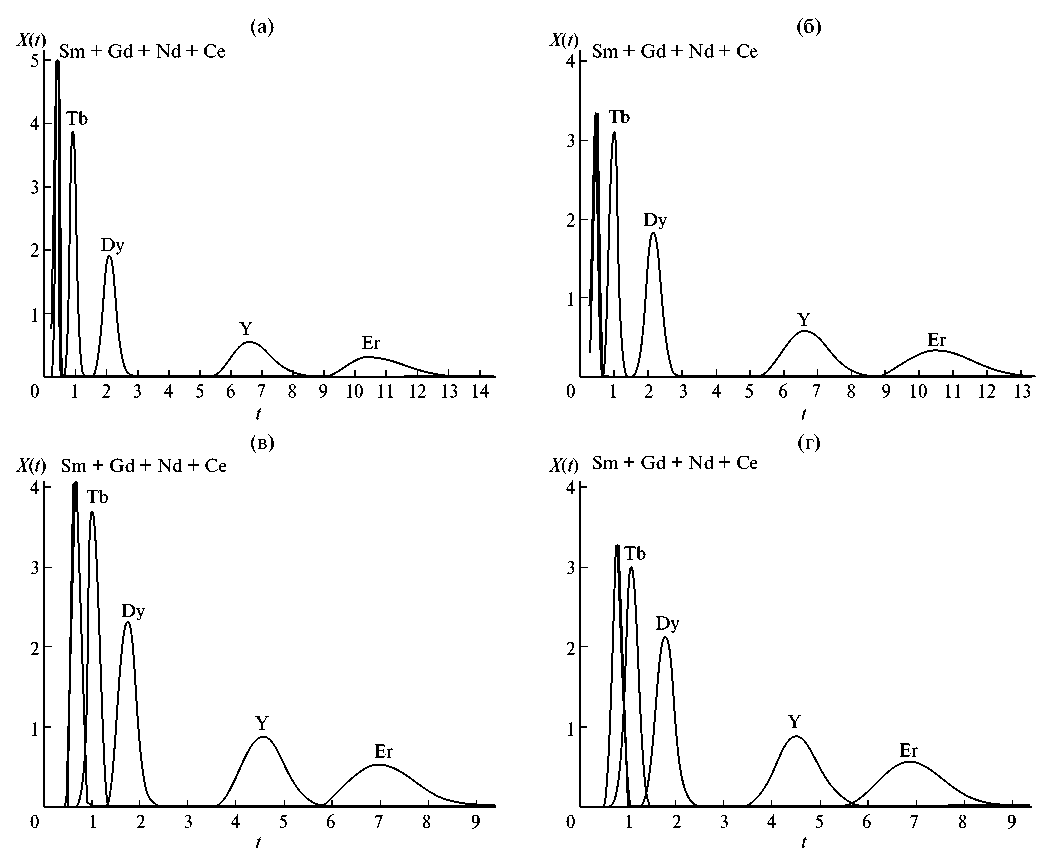 Рис. 2. Моделирование периодического процесса хроматографического разделения РЗЭ в каскаде из 50 смесительно-отстойных экстракторов: a – при длительности загрузки раствора РЗЭ tₛ = 0.2 и задержке органической фазы в экстракторах S = 0.8; б – при длительности загрузки раствора РЗЭ tₛ = 0.3 и задержке органической фазы в экстракторах S = 0.8; в – при длительности загрузки раствора РЗЭ tₛ = 0.2 и задержке органической фазы в экстракторах S = 0.5; г – при длительности загрузки раствора РЗЭ tₛ = 0.3 и задержке органической фазы в экстракторах S = 0.5. Выходные профили концентраций рассчитаны по уравнению (1).
