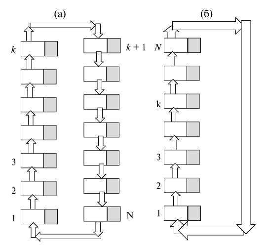 Рис. 4. Схемы соединения ступеней каскада экстракторов при работе в режиме рециркуляционной хроматографии: а – без трубопровода рецикла; б – с трубопроводом рецикла.