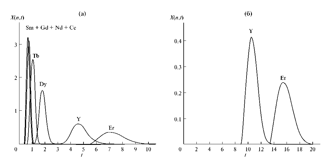 На рис. 3 приведены профили концентраций после двух загрузок раствора РЗЭ в каскадах из 100 смесительно-отстойных экстракторов при длительности загрузки раствора РЗЭ ts = 0.2 и задержке органической фазы в экстракторах S = 0.8, рассчитанные по уравнениям (2), (6) и (8). Результаты расчета свидетельствуют о возможности выделения из исходного раствора 5 фракций элементов: группы Sm+Gd+Nd+Ce и сверхчистые фракции Tb, Dy, Y и Er.