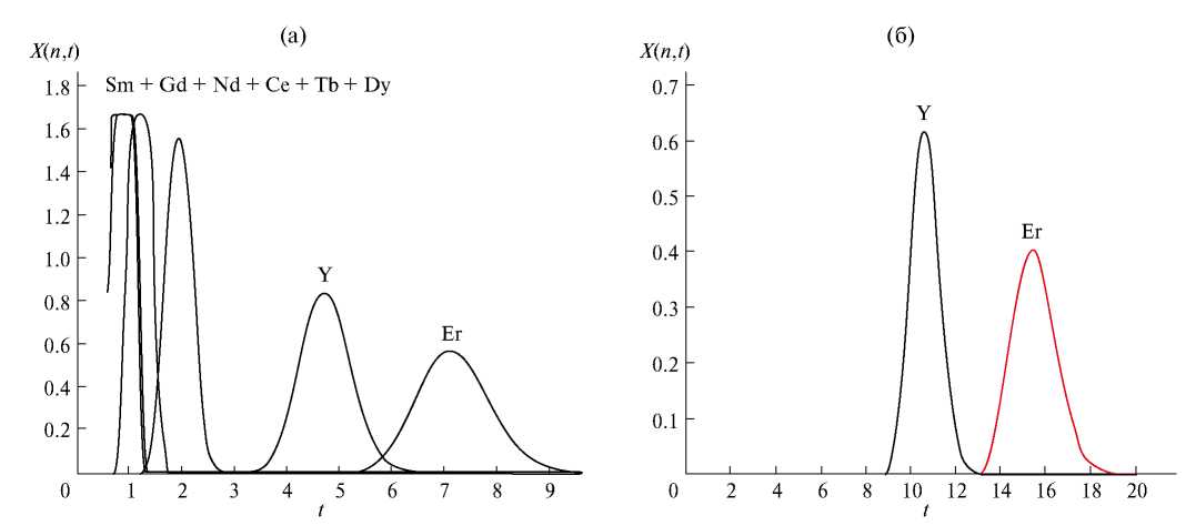 Рис. 5. Результаты моделирования периодического процесса разделения РЗЭ в каскаде из 50 смесительно-отстойных экстракторов в режиме рециркуляционной хроматографии. Параметры процесса: tₛ = 0.3, S = 0.5, b = 1.5