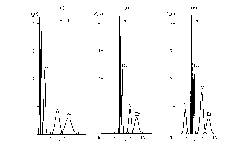 Рис. 3. Профили выходных концентраций после двух последовательных загрузок раствора РЗЭ в каскадах из 100 смесительно-отстойных экстракторов при длительности каждой загрузки tₛ = 0.2 и задержке органической фазы в экстракторах S = 0.8. а – загрузка 1; б – загрузка 2; в – загрузка 3; рассчитанные по уравнениям (2), (6) и (8). Интервал между загрузками tᵢₙ=13.3.