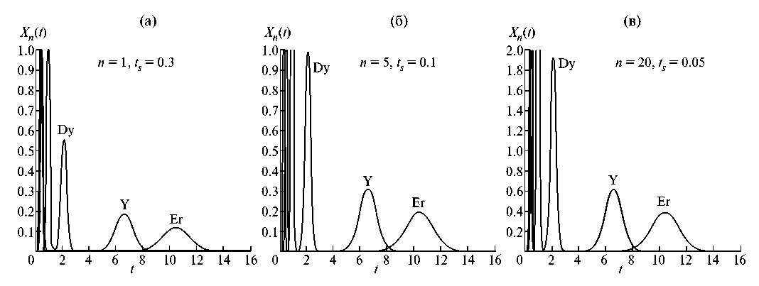 В непрерывных процессах хроматографического разделения раствор РЗЭ подается в каскад через определенные интервалы tin в чередующейся последовательности с “чистой” водной фазой в течение времени ts (τs). Выделение концентрированных фракций РЗЭ из водных растворов методом элюентной хроматографии с прерывистой загрузкой раствора в каскад проводилось следующим образом. При такой многократной загрузке исходного раствора производительность и качество получаемых продуктов зависят от обоих временных параметров – tin и ts. С увеличением ts повышается производительность и концентрации элементов в разделенных фракциях. Однако при этом снижается чистота фракций элементов вследствие расширения их пиков. Принципиальное различие между таким обычным методом многократной загрузки и методом прерывистой загрузки состоит в длительности интервала между последовательными загрузками tin [50]. В первом методе для достижения высокой производительности величина tin должна быть минимальной, но достаточной для разделения хроматограмм отдельных загрузок. Она определяется формулой (8). Во втором методе длительности интервала между последовательными загрузками tin существенно (примерно на порядок) меньше, чем в обычном методе: непрерывная загрузка раствора разделяемых компонентов прерывается короткими периодами подачи в каскад “чистой” водной фазы. Это приводит к слиянию концентрационных профилей (хроматограмм) ряда загрузок и выходу из каскада концентрированных фракций компонентов, сказанное иллюстрирует рис. 8, где приведены расчетные профили РЗЭ на выходе из каскада для различных условий загрузки исходного раствора. Расчет проведен по уравнению (29), которое описывает выходные профили концентраций после многократных (n) загрузок раствора РЗЭ.