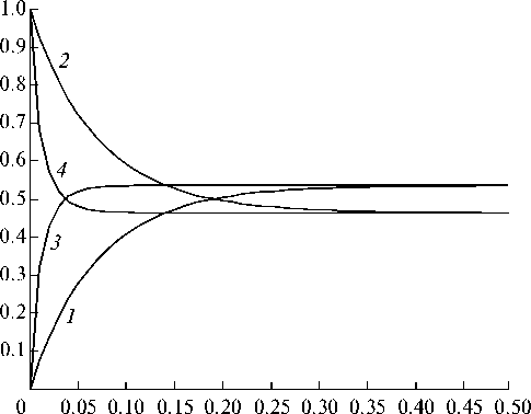 Рис. 5. Динамика концентраций интермедиатов реакции (1) с кинетикой ЗДМ при α = 0 и МДД (x*, z*) при a11 = 2; a12 = 0; a21 = 0; a22 = 1: 1 – z; 2 – x; 3 – z*; 4 – x*.
