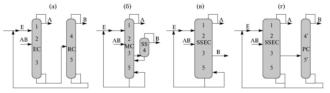 Рис. 1. Различные структуры схем ЭР бинарной смеси с высококипящим разделяющим агентом: (а) – традиционная двухколонная, (б) – схема с частично связанными тепловыми и материальными потоками, (в) – схема, состоящая из одной колонны ЭР с боковым отбором, (г) – схема, включающая колонну ЭР с боковым отбором. A, B – компоненты исходной смеси, E – разделяющий агент, EC – колонна экстрактивной ректификации, RC – колонна регенерации, MC – основная колонна, SS – боковая секция, SSEC – колонна экстрактивной ректификации с боковым отбором, PC – колонна очистки компонента B от разделяющего агента, 1–5 – секции колонн.