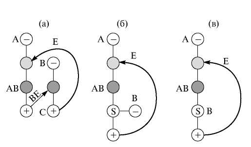 Авторами [38] предложен алгоритм трансформации традиционных схем ЭР, состоящих из двухотборных колонн, в схемы ЭР с частично связанными тепловыми и материальными потоками (PTCED). В соответствии с этим алгоритмом схема CED (рис. 1а) отображается графом, представленным на рис. 2а. Вершины в этом графе соответствуют границам секций колонн, неориентированные ребра – противоположно направленным потокам пара и жидкости в секциях колонн, ориентированные ребра – потокам, связывающим колонны. В результате объединения двух вершин, связанных ориентированным ребром BE, получается граф, представленный на рис. 2б, которому соответствует схема PTCED (рис. 1б). Данная схема состоит из основной колонны (MC) и термически связанной с ней противоположно направленными потоками пара и жидкости боковой укрепляющей секции (SS). При объединении вершин S и B в графе на рис. 2б получается граф, представленный на рис. 2в, который является отображением схемы (рис. 1в), состоящей из одной колонны ЭР с боковым отбором (SC-SSED). В соответствии с терминологией авторов [38] традиционная схема ЭР называется прообразом, а полученные при ее трансформации схемы – образами.