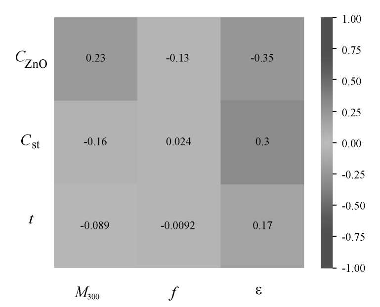 Результатом проведенного моделирования с использованием аппарата нейронных сетей является установление связи между входными параметрами (массовая часть оксида цинка, массовая часть стеариновой кислоты, температуры смешения) и выходными параметрами процесса (условное напряжение при удлинении на 300%, условная прочность при растяжении, относительное удлинение при разрыве). Результаты моделирования представлены на следующих рисунках (рис. 5–7).