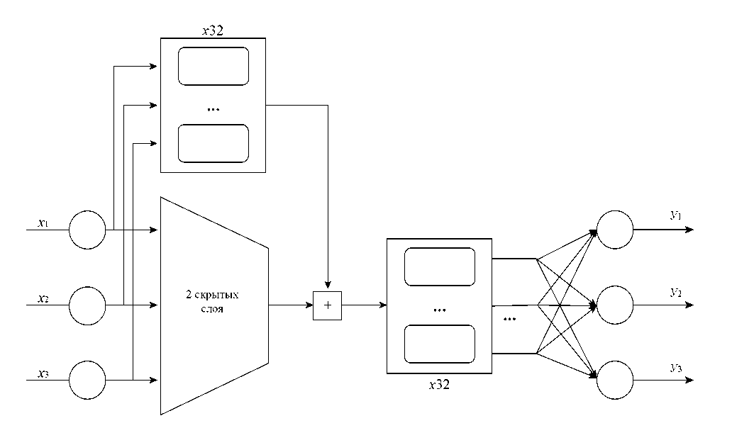 С целью повышения точности аппроксимации использована измененная архитектура многослойного персептрона (рис. 3), которая представляет собой сеть с трансляцией входных данных на выходной слой персептрона, с блоком скрытых слоев, представленных на рис. 4. Указанная сеть имеет следующие особенности: используется механизм, обеспечивающий ускоренное обучение [27–28], а также обладает большой шириной относительно количества входных параметров.