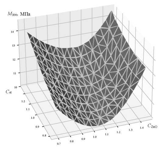 Рис. 5. Зависимость условного напряжения при удлинении на 300% от концентрации оксида цинка и стеариновой кислоты.