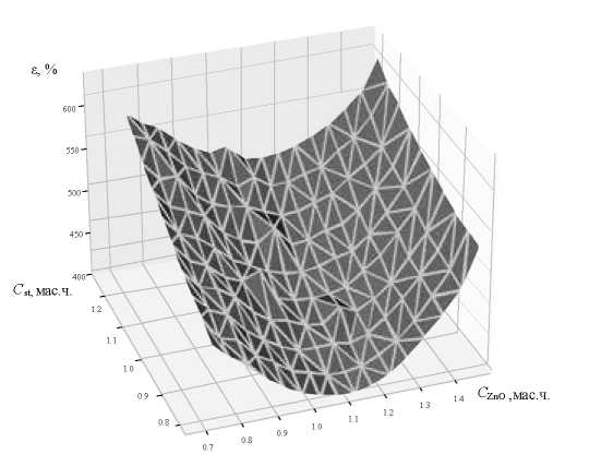 Рис. 7. Зависимость относительного удлинения при разрыве от концентрации оксида цинка и стеариновой кислоты.