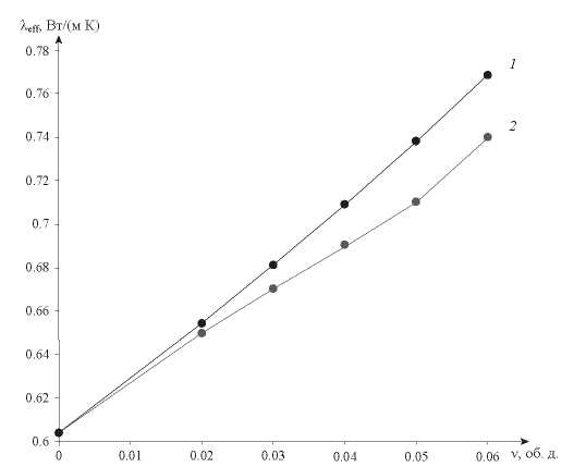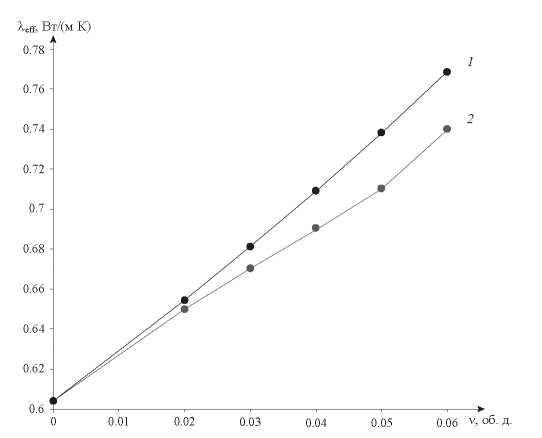Рис. 1. Изменение теплопроводности для наножидкости Al2O3-вода: 1 –модель Максвелла; 2 – модель, учитывающая промежуточный слой.