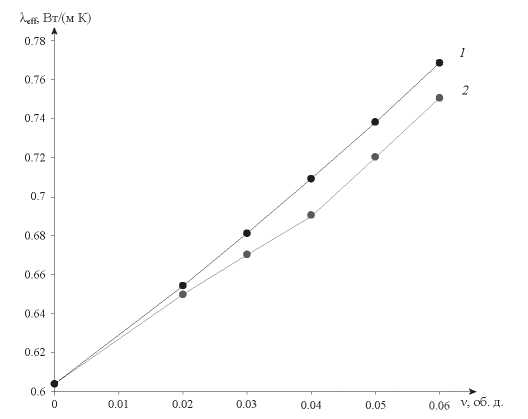 Виден существенный рост теплопроводности при увеличении объемного содержания частиц дисперсной фазы.
