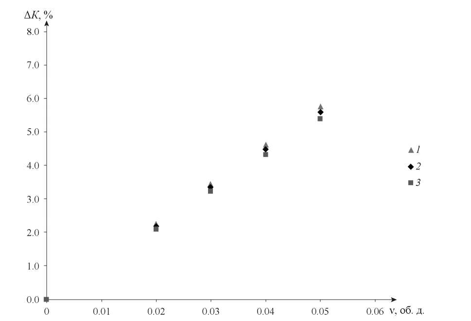 Рис. 5. Зависимость роста коэффициента теплопередачи от объемной доли наночастиц в ректификационной колонне для выделения ацетона: 1 – однослойные углеродные нанотрубки; 2 – наночастицы оксида алюминия; 3 – наночастицы оксида меди.