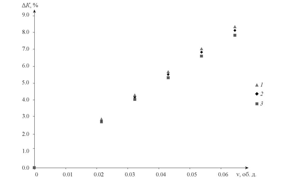 Рис. 4. Зависимость роста коэффициента теплопередачи от объемной доли наночастиц в ректификационной колонне для выделения пероксида водорода: 1 – однослойные углеродные нанотрубки; 2 – наночастицы оксида алюминия; 3 – наночастицы оксида меди.
