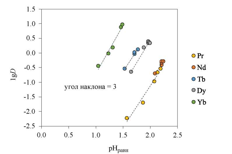 Подтверждение состава экстрагируемого соединения проводили с использованием метода угла наклона в предположении, что реакция экстракции ионов металлов является простым катионным обменом без учета дополнительных взаимодействий. На рис. 2 представлена билогарифмическая зависимость коэффициента распределения от равновесной концентрации протона в водной фазе после экстракции (pHравн). Из формулы (7) следует, что угловой коэффициент зависимости lgD от должен быть равен трем для исследуемых трехвалентных металлов, что подтверждается полученными результатами. Анализ полученных данных позволяет сделать вывод, что ионы легких и тяжелых РЗЭ из нитратных растворов с использованием HDES ДТМПФК/фенол извлекаются в виде катиона Me3+.