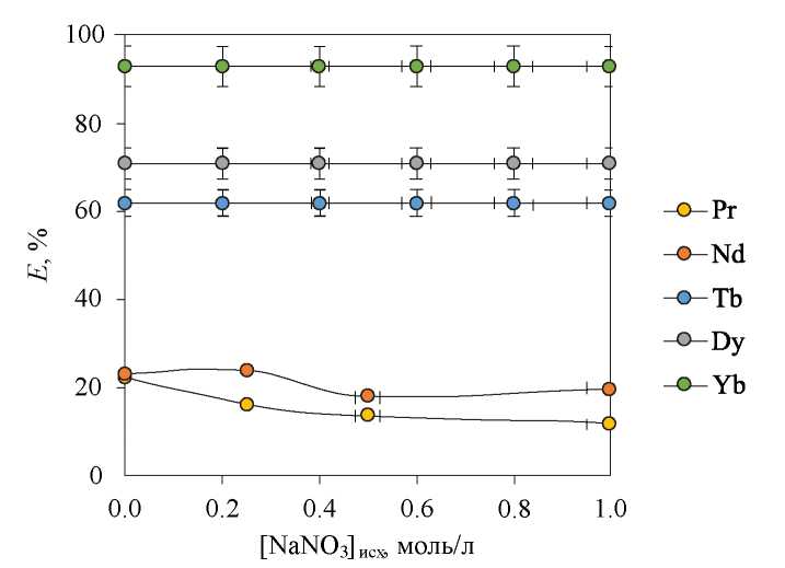 Зачастую введение в водные растворы дополнительных электролитов приводит к изменению активности компонентов системы, что отражается на характеристиках их межфазного распределения. Изучено влияние концентрации нитрат-анионов на эффективность экстракции исследуемых металлов (рис. 3). Концентрация введенного в систему NaNO3 находилась в диапазоне от 0.2 до 1 моль/л. Для всех ионов металлов степень извлечения практически не изменяется во всем исследуемом диапазоне.