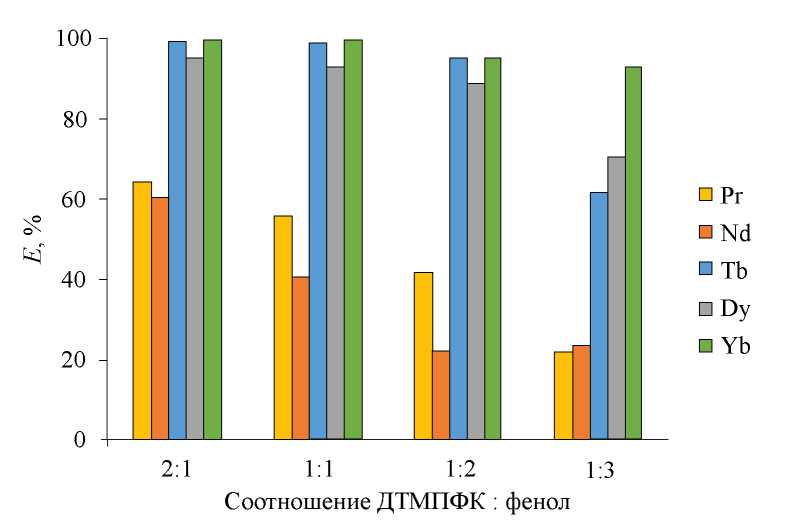 На рис. 5 представлена зависимость степени извлечения ионов РЗЭ от соотношения диалкилфосфиновой кислоты и фенола в составе HDES. Для получения данной зависимости были использованы следующие составы HDES ДТМПФК/фенол с соответствующими концентрациями ДТМПФК: 2 : 1 (2.78 моль/л), 1 : 1 (2.48 моль/л), 1 : 2 (2.04 моль/л) и 1 : 3 (1.72 моль/л). Увеличение концентрации ДТМПФК приводит к линейному возрастанию степени извлечения РЗЭ в органическую фазу. Наилучшая селективность при извлечении ионов РЗЭ из растворов их нитратных солей наблюдается при соотношении компонентов 1 : 3.