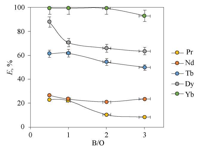 Концентрацию РЗЭ в исходном растворе и в водной фазе после экстракции определяли спектрофотометрическим методом с использованием ксиленолового оранжевого относительно холостых растворов при значении рН 5.6. Концентрацию ионов металлов в органической фазе определяли по материальному балансу. Относительная погрешность спектрофотометрического измерения составила менее 5%. Представленные экспериментальные данные являются результатом серии экспериментов и обработаны методами математической статистики.