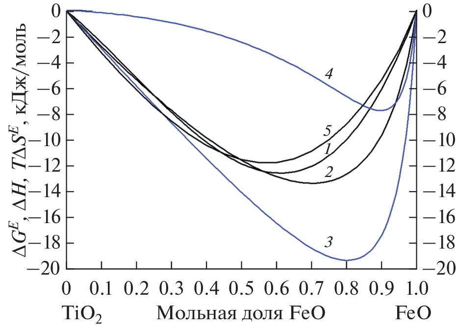 High-temperature differential mass spectrometry was used to study the vaporization processes and thermodynamic properties of samples of the Fe2O3–TiO2 system containing 25, 35, and 45 mol. % iron oxide. As shown earlier, at temperatures above 1400 K, Fe2O3, losing oxygen, turns into FeO. Therefore, in this article, a mass spectrometric thermodynamic study of the FeO–TiO2 system was carried out at a temperature of 1760 K. The composition and partial pressures of vapor, as well as the values of FeO activities and excess Gibbs energy in the FeO–TiO2 system were determined. Using the Wilson polynomial made it possible for the first time to estimate the mixing enthalpy and excess entropy in the FeO–TiO2 system at 1760 K. The thermodynamic properties of melts of the FeO–TiO2 system at 1760 K were modeled using the generalized lattice theory of associated solutions, and the relative numbers of bonds of various types in the model melt lattice were calculated, indicating the preferential formation of Fe–O–Ti bonds at a FeO content of 55 mol %. It is shown that at a temperature of 1760 K, the found values of the excess Gibbs energy in the FeO–TiO2 system are evidence of negative deviations from the ideality.