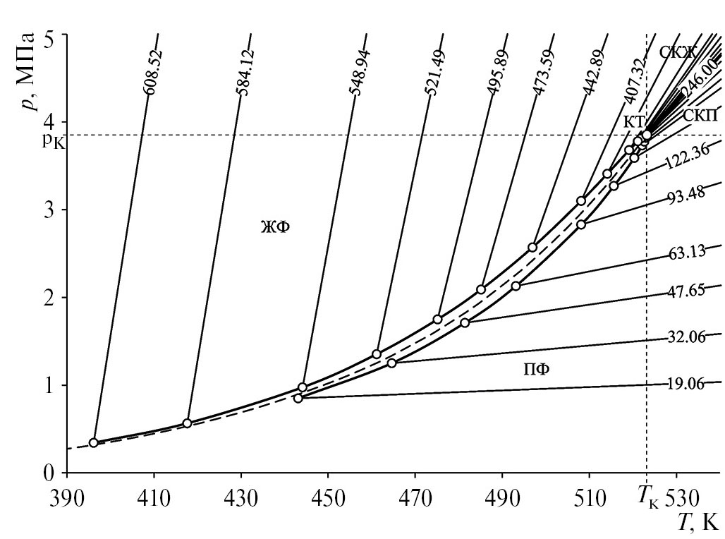 Для определения параметров ФП и особенно КС системы 1-пропанол–н-гептан методом пьезометра постоянного объема по фигуративным точкам изломов и изгибов необходимо проведение измерений р, ρ, Т, х в диапазоне температур, включающем двухфазную, однофазную (жидкую, паровую), околокритическую и сверхкритическую области. Фазовая диаграмма в (р, Т)- координатах системы 1-пропанол–н-гептан состава 0.5 мол. долей компонентов, полученная в эксперименте в диапазоне температур 393.15–623.15 К и давлений до 60 МПа, приведена на рис. 1. Такой же вид имеют фазовые диаграммы системы составов 0.2, 0.38 и 0.8 мол. долей н-гептана. Значения параметров ФП жидкость–пар → жидкость, жидкость–пар → пар, определенные по фигуративным точкам изломов (изгибов) изохор фазовых диаграмм в (р, Т)-координатах, и фактора сжимаемости Zs = psVms/ /(RTs) = ps/(ρmsRTs) приведены в табл. 1 [15].