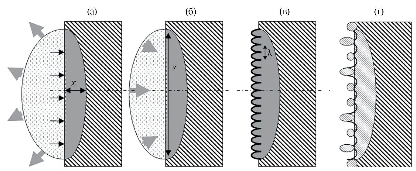 Рис. 1. Схема капиллярного механизма взаимодействия лазерного импульса с металлической подложкой и выбор масштаба резонатора s (длины ванны расплава): (а) – образование газовой каверны и расплава металла глубиной под действием лазерного импульса, (б) – формирование стоячих деформационных волн под действием схлопывающейся газовой каверны, (в) – усиление деформационными волнами стоячих капиллярных волн на поверхности расплава, (г) – застывание капиллярных волн и формирование поверхностного рельефа.