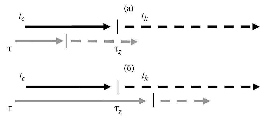 Рис. 3. Схематичная иерархия характерных времен при образовании нанорельефа на подложке методом лазерной абляции в случае одинакового диаметра лазерных лучей: (а) – для короткого лазерного импульса [2], (б) – для длинного лазерного импульса [7]; tc – время схлопывания каверны, tk – время капиллярного колебания, τ – время подвода лазерного излучения, tz – время образования кристаллического зародыша.