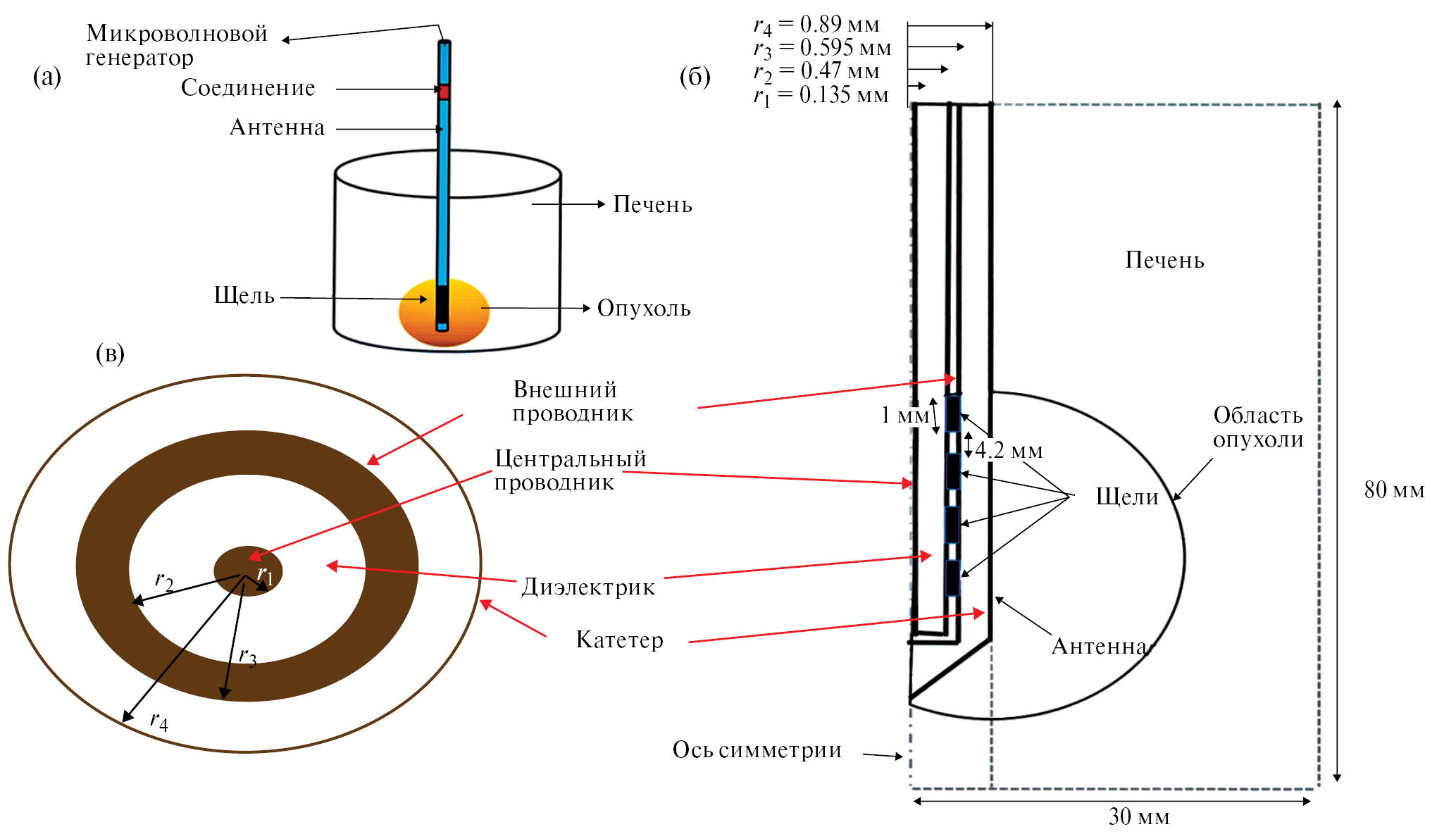 Рис. 1. Схема коаксиальной антенны, введенной в биологическую ткань (а), ее 2D-модель с размерами (б), поперечное сечение антенны с несколькими щелями (в).