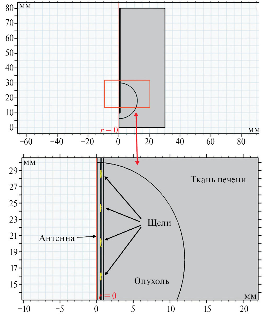 Ткань печени рассматривается как объект с цилиндрической геометрией. Она имеет радиус 30 мм и высоту 80 мм. В этой модели предполагается, что СВЧ-антенна погружена в однородную гладкую биологическую ткань. Свойства ткани печени и антенны приведены в табл. 2.