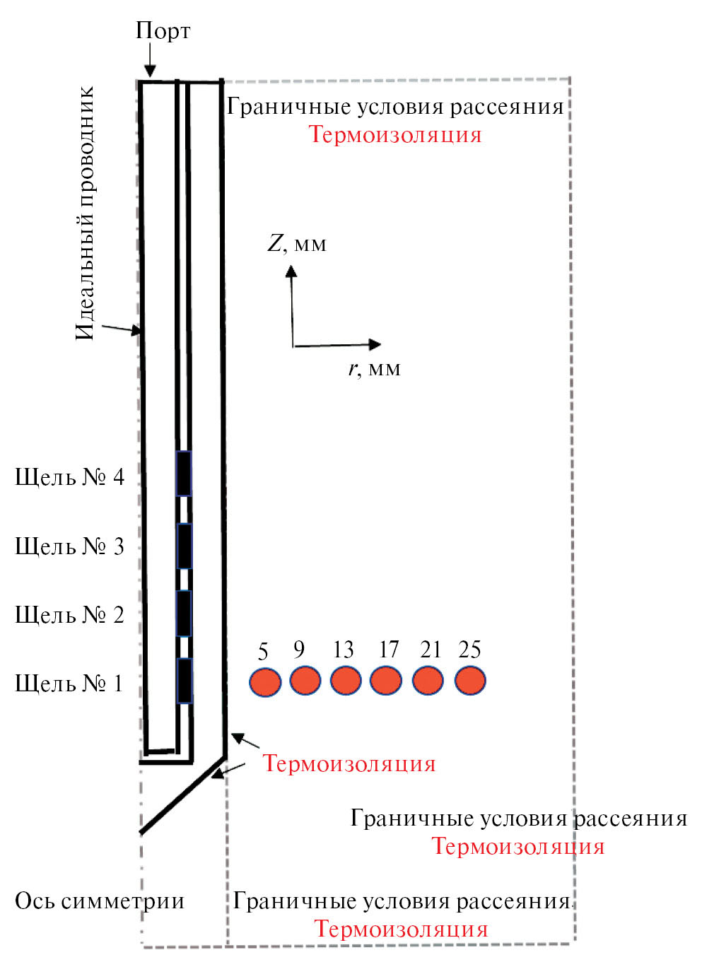 Геометрическая схема многощелевой коаксиальной СВЧ-антенны изображена на рис. 1. СВЧ-антенна состоит из центрального проводника, диэлектрического материала, внешнего проводника и катетера из пластика, защищающего внутренние детали. Поскольку реальная антенна имеет цилиндрическую и коаксиальную форму, моделирование выполняется только для двумерной осесимметричной постановки в цилиндрических координатах (r, φ, z).