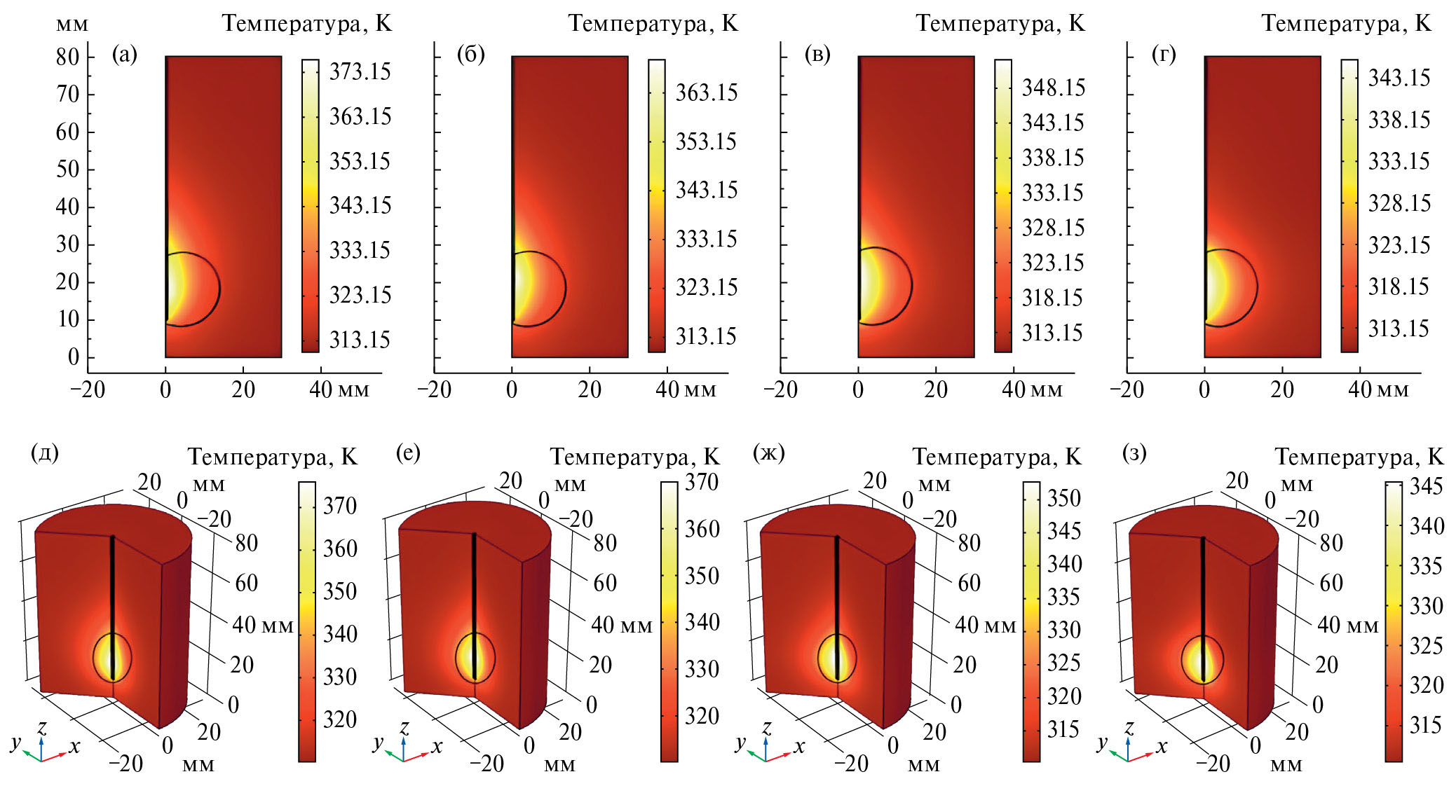 8. Fig. 7. Temperature distributions and corresponding three-dimensional temperature fields: (a), (d) one slit; (b), (e) two; (c), (g) three; (d), (h) four.