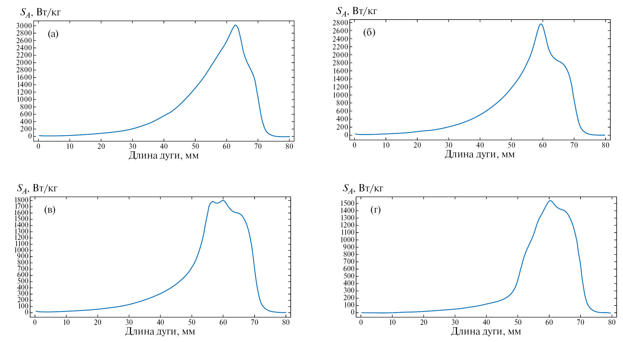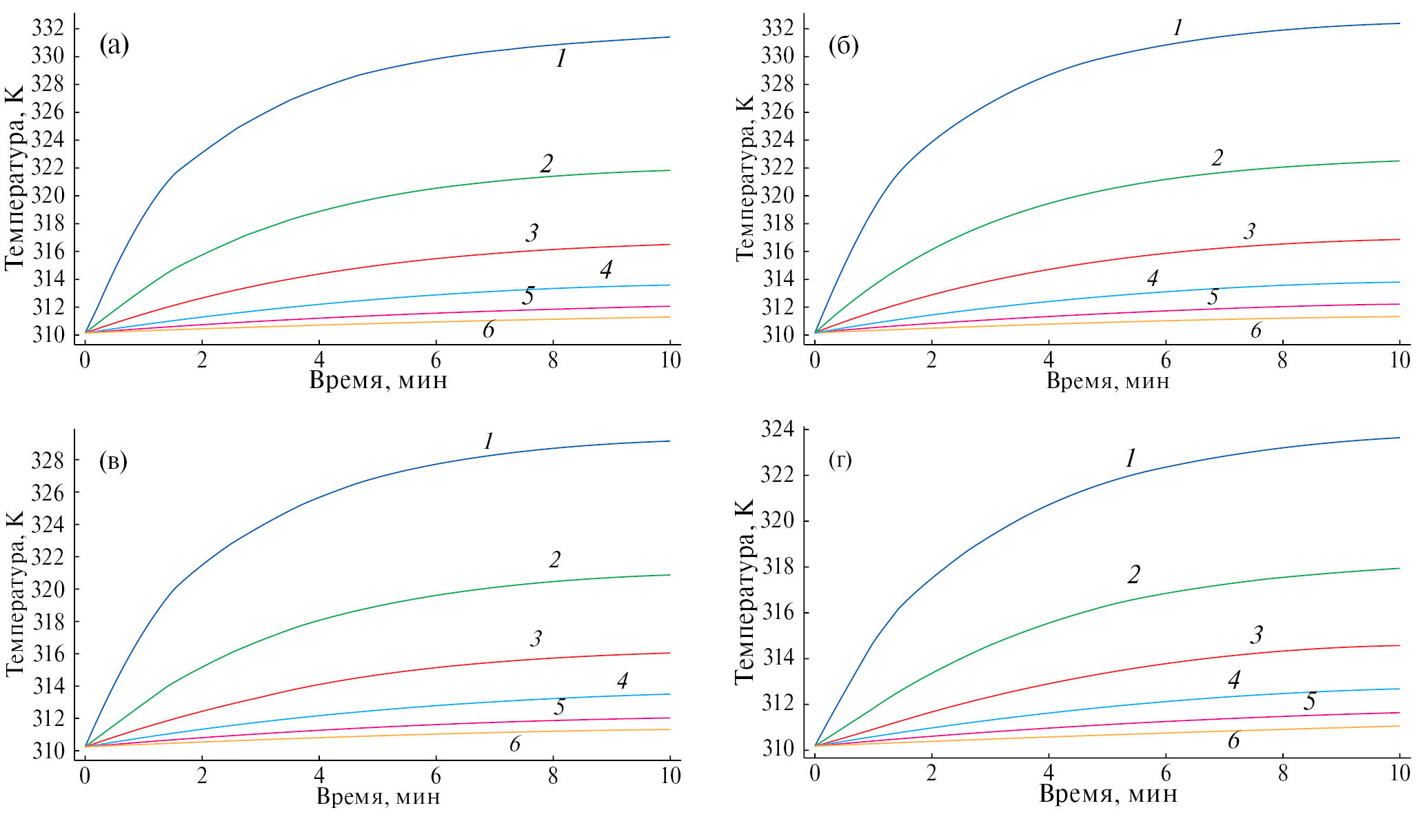 Рис. 11. Сравнение температурных кривых для положений: 1 – 5 мм, 2 – 9, 3 – 13, 4 – 17, 5 – 21, 6 – 25; для антенн с (a) одной, (б) двумя, (в) тремя, (г) четырьмя щелями.