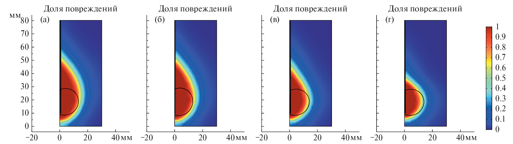 Рис. 10. Изменения во времени доли повреждений для антенн с (a) одной, (б) двумя, (в) тремя, (г) четырьмя щелями.
