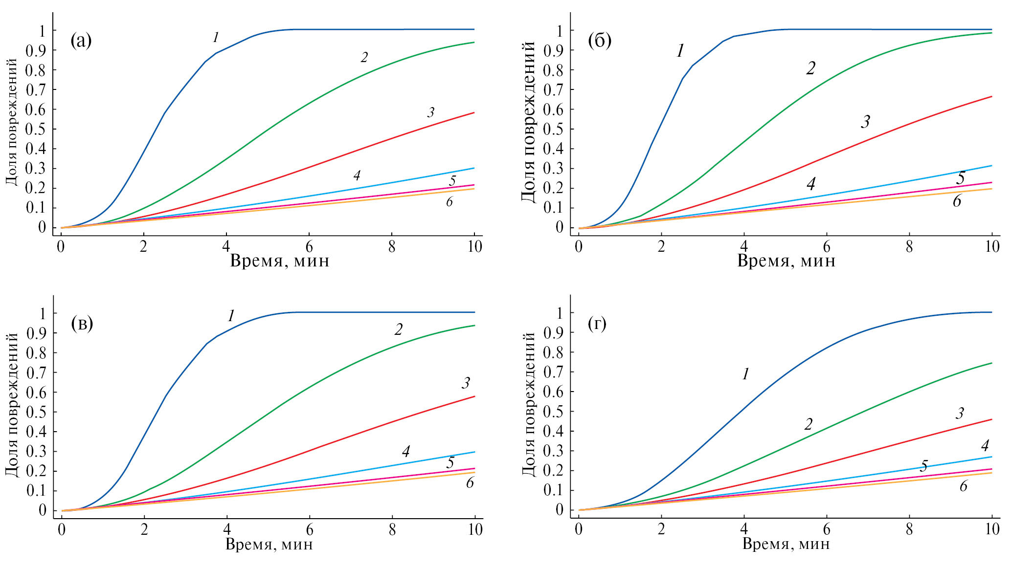 Рис. 12. Сравнение зависимостей доли повреждений для положений: 1 – 5 мм, 2 – 9, 3 – 13, 4 – 17, 5 – 21, 6 – 25; для антенн с (a) одной, (б) двумя, (в) тремя, (г) четырьмя щелями.
