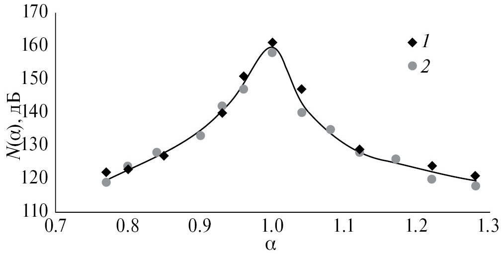 Температура горения стехиометрической смеси и скорость звука на входе в камеру сгорания имеют максимальные значения. Как известно, частота акустических колебаний газа в трубе прямо пропорциональна скорости звука [9]. Следовательно, можно было ожидать, что при α = 1 частота колебаний газа – максимальная. Измерения амплитуды колебаний давления на входе в камерах сгорания показали (рис. 5), что этот параметр, в отличие от частоты колебаний, имеет максимальное значение для α = 1.