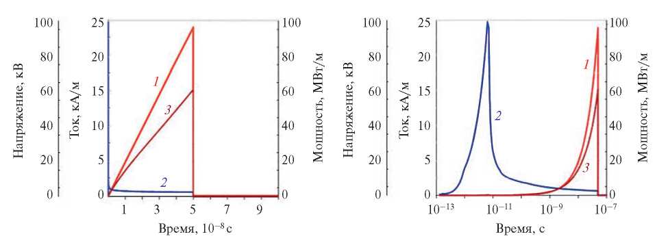 Рис. 2. Структура треугольного импульса разряда длительностью 50 нс: 1 – суммарный ток, 2 – напряжение на промежутке размером 1 мм, 3 – суммарная мощность.