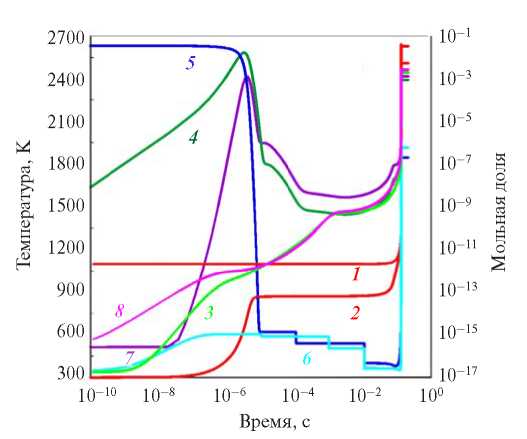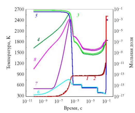 Рис. 5. Эволюция температуры и концентраций основных компонентов состава метано-воздушной смеси после температурной и химической активаций путем частичной диссоциации азота: 1, 2 – температура; 3, 6, 8 – мольные доли атомарных кислорода, азота, водорода (при термической активации); 2, 4, 5, 7 – при N-активации.
